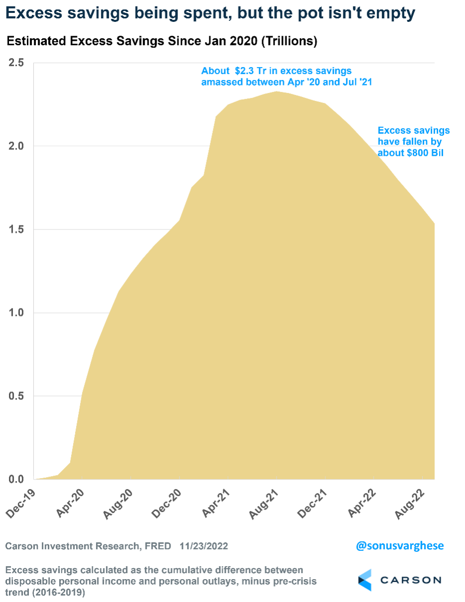 Excess savings were drawn down this year because income gains were not keeping up with prices. But as inflation eases, real incomes will likely start rising again, and the rate at which that excess savings pot gets depleted should slow down.
