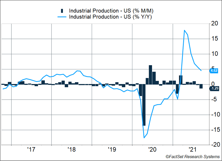 • U.S. industrial production slid 1.3% last month as the shortage of semiconductors pushed auto production down 7.2%.