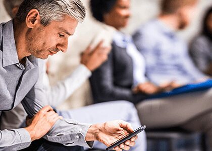 Business professional using his tablet to check his financial numbers