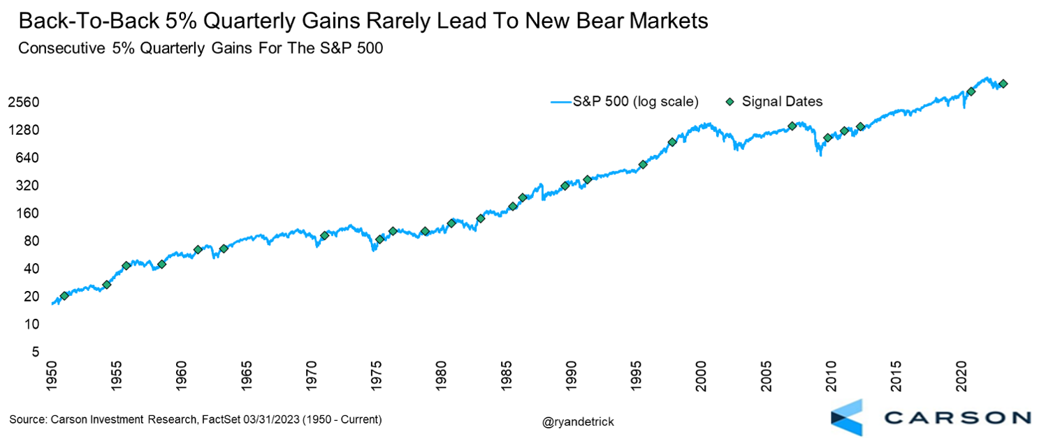 We continue to be cautiously bullish overall, and one reason is that after gaining 7.1% in the fourth quarter, the S&P 500 added another solid 7.0% (price only, no dividends) last quarter. Many market watchers have been calling this a bear market rally, but history shows that consecutive 5% quarters rarely happen in the middle of bear markets. More often than not, they occur at the start of new bull markets. As the chart below shows, this rare signal suggests the potential for more strength, not the start of a new bear market. In fact, two quarters later stocks have been higher 21 out of the past 23 times after this bullish signal.