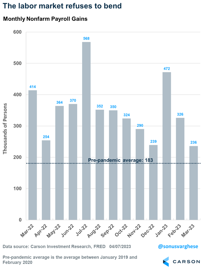 Instead, we got yet another solid payroll report, with 236,000 jobs created in March. While below the 346,000 average of the prior three months, this is very strong. The economy was creating about 180,000 jobs a month prior to the pandemic and needs 100,000 or so to keep up with population growth. It is currently more than doubling that amount.