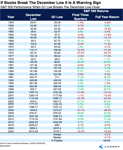 One of our favorite indicators at Carson Investment Research is the December Low Indicator, which is fairly straightforward. When the S&P 500 doesn’t close beneath the December low in the first quarter, the market has typically been positive the rest of the year. The opposite, of course, is when the December lows are violated in the first quarter. Last year, the S&P 500 didn’t break the December low, and it was a great year. However, a break in early 2022 indicated elevated odds that the rest of the year could be dicey. Given that stocks didn’t break their December low this year, this signal is less worrisome.