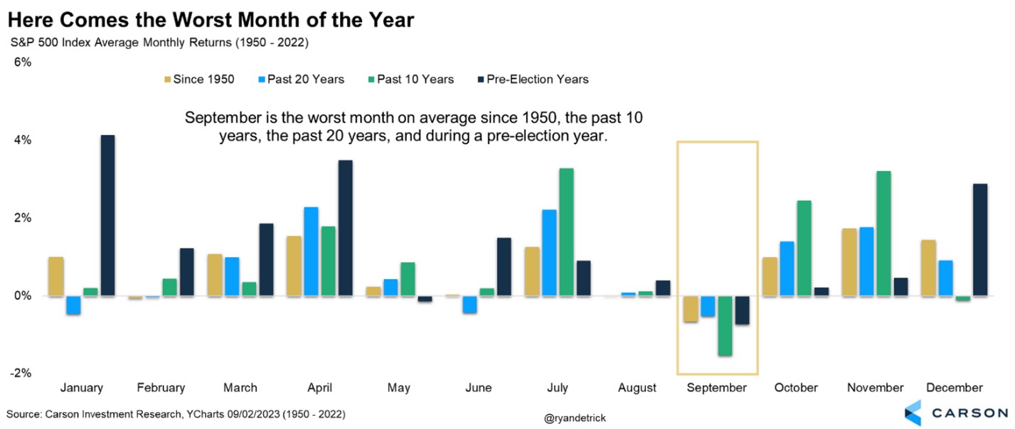 Stocks have had a rough start to September on the heels of an August slump. As we noted last week, this type of seasonal weakness is normal. The chart below shows that during various timeframes, August and September can be tricky. September, specifically, has been the worst month of the year looking back 10 years, 20 years, and since 1950. It has also been the worst performer during pre-election years.