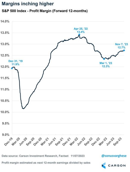 Even more surprising than record profits is improved profit margins. Over the past year, we have heard frequently that profit margins are too high and must fall. Since March, forward 12-month profit margins have increased. If both profits and profit margins increase next year, equities should have a substantial tailwind.