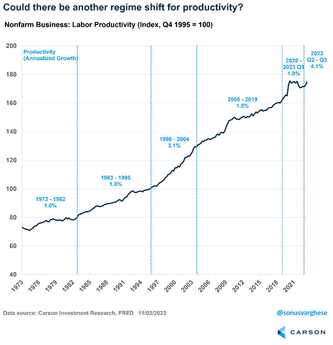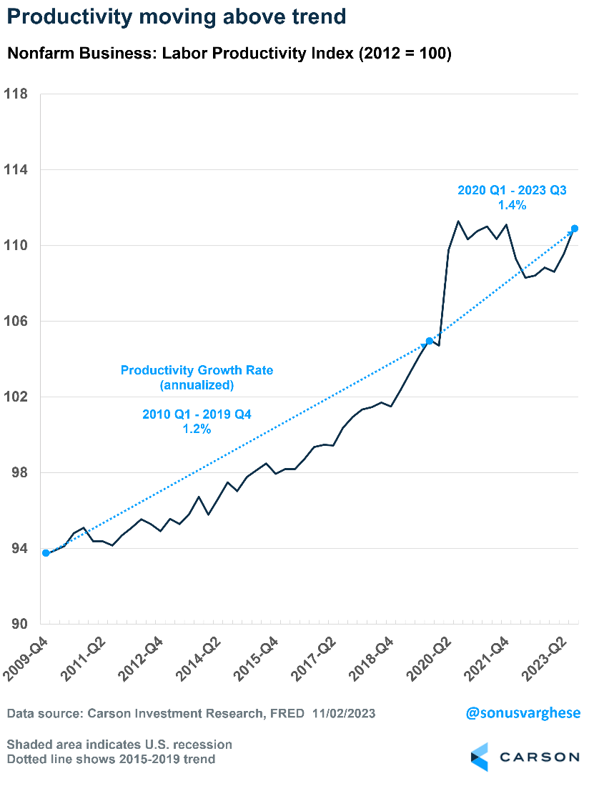 Lost in all the consternation over a weak payroll report this month was robust productivity data, which was released earlier. Labor productivity rose at an annualized pace of 4.9% in the third quarter. This is not entirely surprising because we knew output surged during the quarter and hours worked didn’t change significantly. In short, private sector workers across the economy produced a significantly higher amount of output without substantially increasing the amount of time they worked in aggregate. This kind of productivity strength, if it continues, can have big implications.