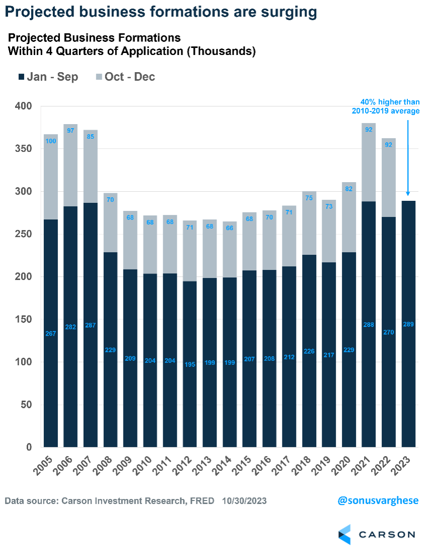 Encouragingly, business applications are currently surging. The Census Bureau measures applications that have a “high propensity” of turning into a business with a payroll, as well as applications that include a first-wages-paid date on IRS forms. On a year-to-date basis (January-September), the Census Bureau’s projection of business formations is running 7% above the same period in 2022. It’s also 40% above the 2010-2019 average and 4% above the 2005-2007 average.