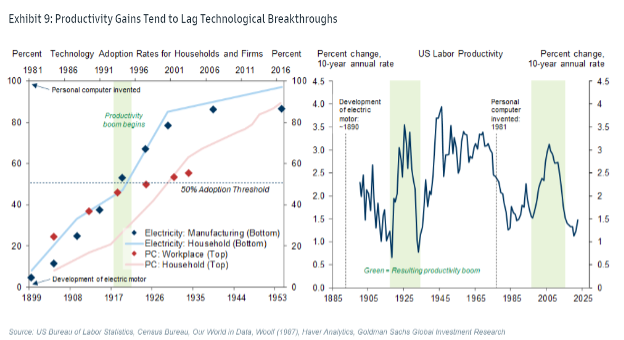 But it can take a while for technological breakthroughs to translate into productivity. The chart below from Goldman Sachs shows how productivity booms driven by milestone technologies, including motor vehicles and personal computers, lagged the initial innovation by more than a decade. They only showed up in the macroeconomic data after half of impacted businesses had adopted the technology.