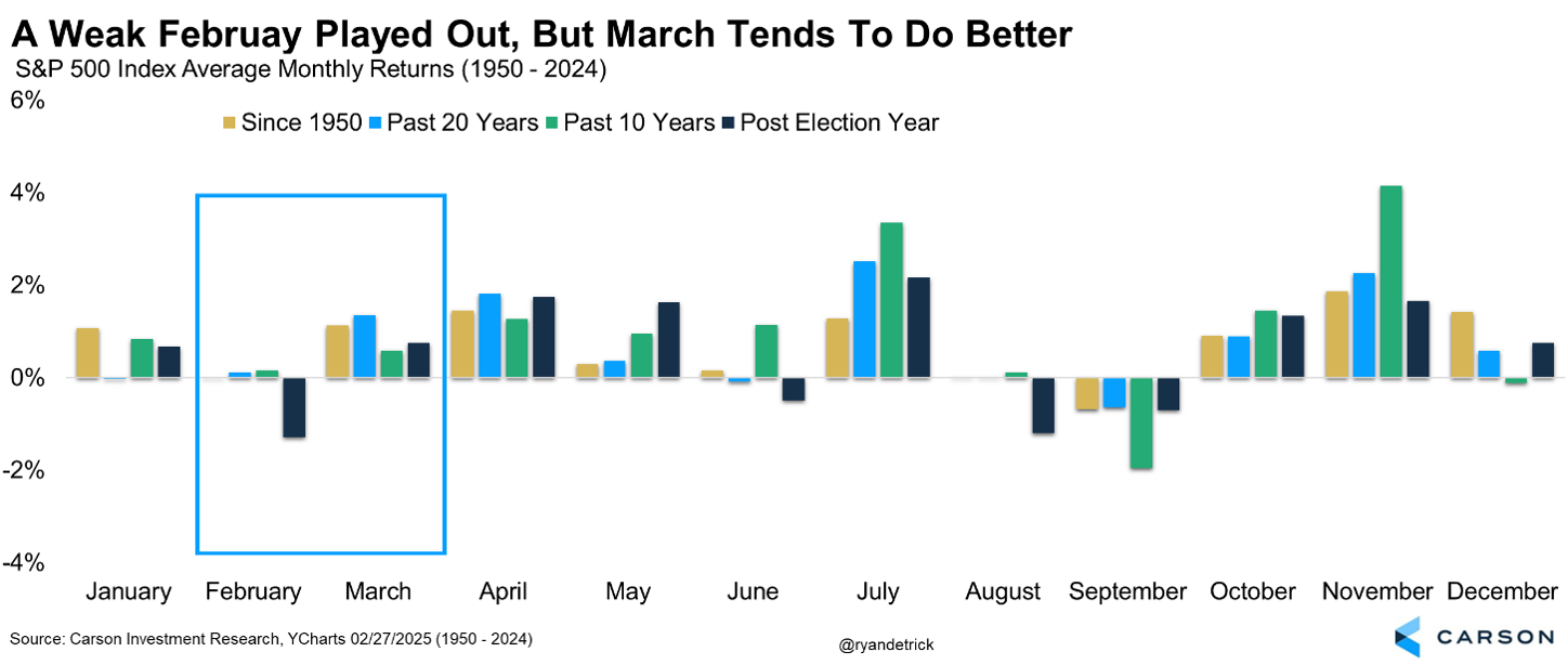 The second half of February was rough, as worries over the economy, tariffs, and large cap tech weakness dominated the conversation. Here’s the thing. Yes, the year-to-date gains we saw in January have vanished, but as we’ve noted before, early in a post-election year things tend to be choppy. Not to mention February is a weak month historically, especially in a post-election year. So in a way, this is normal and not a reason to panic.