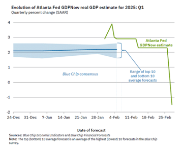 Even as the world’s attention last Friday was focused elsewhere, we got a real doozy of a data update in a corner of the economic universe that usually doesn’t get much play. The Atlanta Federal Reserve’s Real GDP “Nowcast” for Q1 plunged from 2.3% to -1.5%. Yeah, that’s not a typo, nor is it a computation error by the folks who run what is normally a very good, and popular, GDP growth tracker (typically even better than economists’ consensus forecast, which right now is close to 2% for Q1). The GDP Nowcast is a running estimate of the GDP growth in the current quarter and is continually updated as data are released. However, as this latest batch of data just showed, the nowcast has a big flaw, which gets to why the GDP growth tracker collapsed. In short, you shouldn’t panic, though that doesn’t mean there are no concerns.