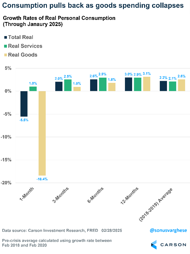 The GDP nowcast estimates a 0.87%-point contribution from consumption to real GDP growth in Q1. That’s just about half the contribution we saw in 2023 and 2024. After adjusting for inflation, personal consumption fell 0.5% in January (equivalent to 5.5% on an annualized basis). This was driven by a 18.4% annualized decline in goods spending, as Americans bought fewer cars, furnishings, appliances, and recreational goods in January. There are several “one off” reasons for this, including the fires in California and unseasonably cold weather in the South—factors which suggest we could see a rebound in February and March.