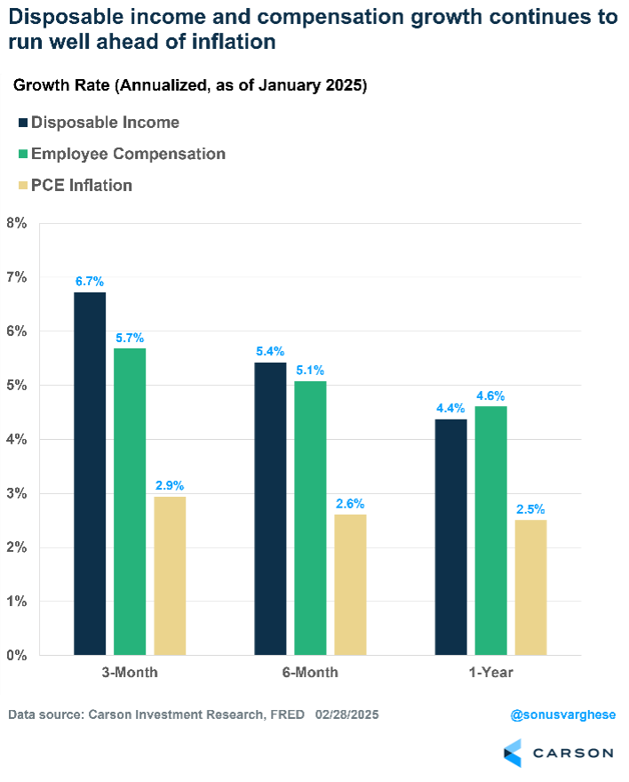 The good news is that income growth, which is what has driven spending for the last two years, was strong in January. Disposable income surged 0.9%, which translates to an annualized pace of 11.1%. This was mostly because social security benefits rose by 2.8%, as the government adjusted them higher for inflation. Looking at the last three months, disposable income has risen at an annualized pace of 6.7%. If you exclude the impact of government transfers (including Social Security, Medicare, and Medicaid) and things like dividend and interest income, you’re left with employee compensation, and that’s also strong. Employee compensation rose at an annualized pace of 5.4% in January and was up 5.7% annualized over the past three months. These numbers are well ahead of the pace of inflation. Headline inflation as measured by the Fed’s favored metric, the Personal Consumption Expenditures (PCE) Index, rose 2.9% annualized over the last three months.