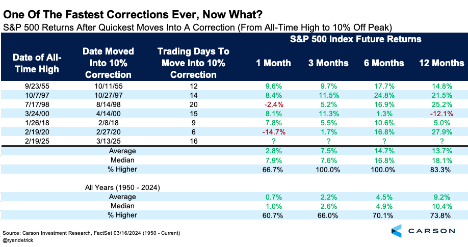 Another angle on the correction though is how quickly it happened. If your head is spinning at going from an all-time high to down more than 10%, then you aren’t alone, as this was one of the quickest trips ever to do just that. In fact, it took only 16 trading days to achieve this dubious feat, but it turns out this isn’t really bad news.