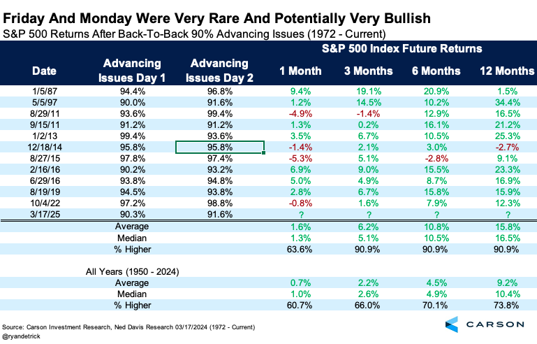 The last time we saw this was in early October 2022, right as that bear market was ending. You can see on the table below we’ve seen strong returns after previous buying thrusts, with the S&P 500 higher six months later 10 out of 11 times and up nearly 11% on average. This coupled with the data from above suggests the potential for better-than-expected returns over the next six months, which might surprise many investors who are positioned for the worst.