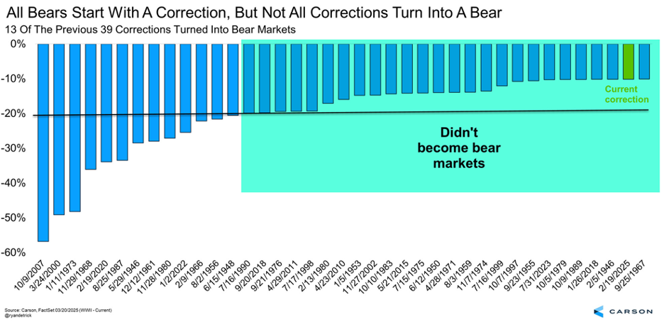 We found 13 official bear markets (down 20% from recent highs) going back to World War II, with many asking whether this could become number 14. We don’t think so, and a nice way to show this is to highlight that most corrections don’t become bear markets.