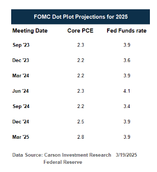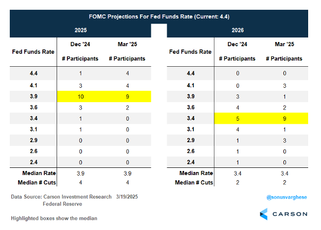 The Federal Reserve concluded its latest policy meeting Wednesday and opted to keep the fed funds rate unchanged, leaving it at a target range of 4.25-4.5%. This was not unexpected, but all eyes were on the Fed’s “dot plot” (expected path of interest rates) and the rest of its Summary of Economic Projections (SEP). The SEP is updated every three months and contains individual member estimates of the fed funds rate over the next few years, as well as estimates of key economic variables (unemployment rate, inflation, GDP growth). The last update was in December and was viewed hawkish. This time around, there was a big question around what members would do with their inflation projection, especially in the face of tariffs, and how they would shift their policy rate projections. It was interesting to say the least, with members projecting higher inflation, higher unemployment, and slower growth: