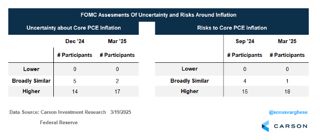 Along with their dot plot, Fed members also put out their expectations for uncertainty and risks around economic variables like inflation and unemployment, assessing whether it was lower, broadly similar, or higher. This got a lot of play in December, as there was a big jump in members who viewed uncertainty and risks around inflation to be higher. Even more members think this as of March.