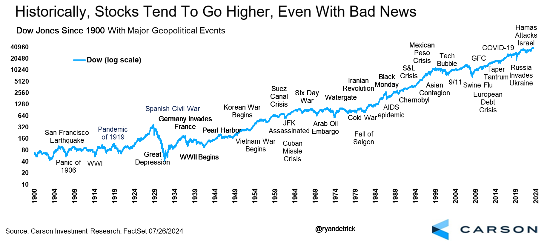 From Washington drama, to geopolitical risks, to renewed concern about a slowing economy, the worries are no doubt building and investors have a lot to think about right now. In times like this it’s important to remember that all years have scary headlines and things to worry about. Here’s a chart we made going all the way back to 1900 that shows how stocks tend to go higher over time, even amid horrible headlines.