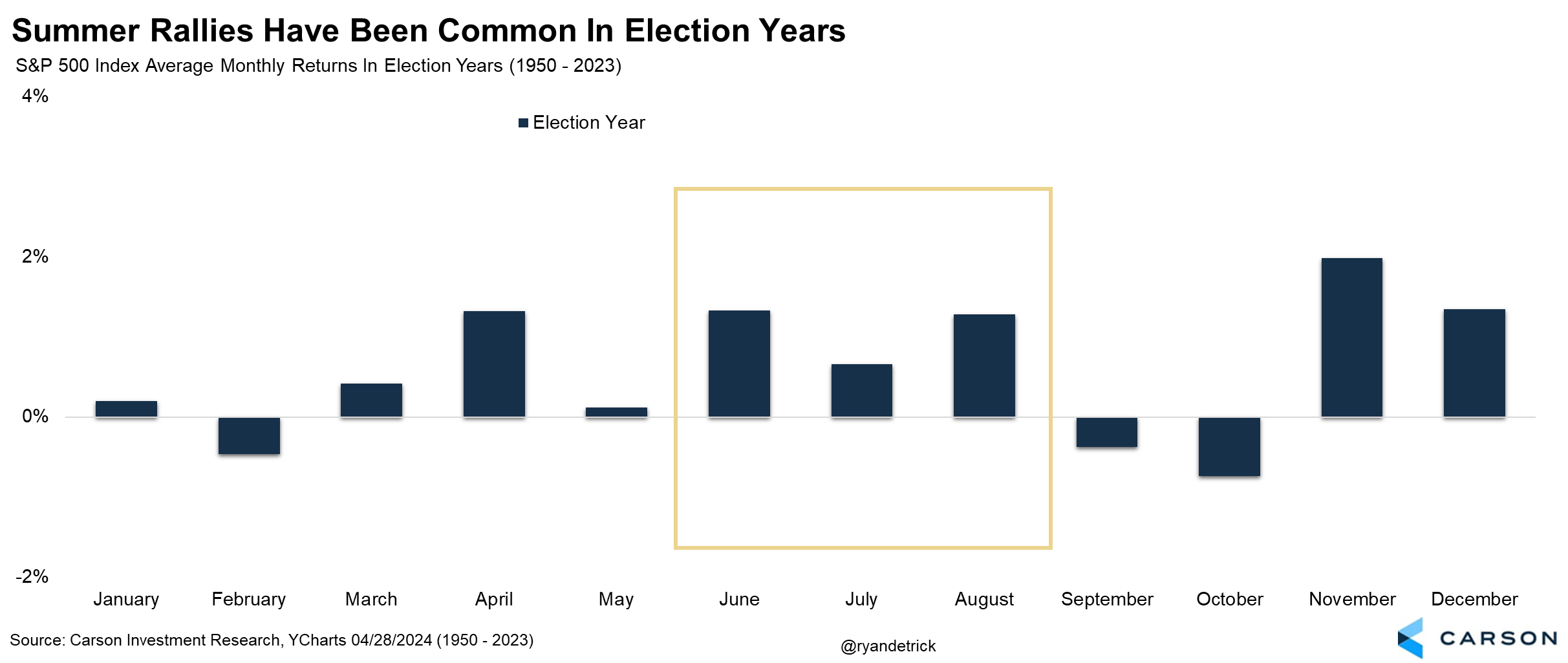 Here’s a chart we’ve shared a lot lately and it was one reason we expected a surprise summer rally when so many were telling us the yield curve and LEIs were reasons to be bearish, a narrative that is now several years old. The bottom line is June, July, and August are historically the best three months for investors in an election year and this year has again rewarded them so far.