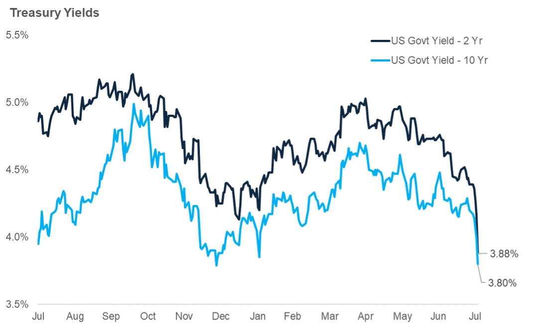 Friday’s non-farm payroll number missed expectations at only 114,000 jobs versus expectations of 175,000, with the prior month revised lower as well. Healthcare and government, which had dominated prior reports, showed less of an impact in July. While 114,000 jobs created was below expectations, the number was still positive and not the lowest we’ve seen in the past year (April came in at 108,000 jobs). There are also indications that hurricane Beryl impacted the number based on how the data is collected. Lastly, the increase in construction jobs was interesting, coming in at a solid 25,000 jobs added.