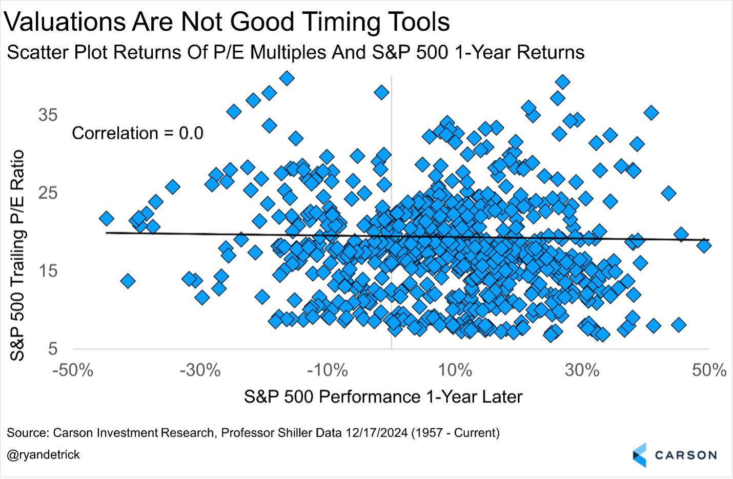 Do you like buying things when they are pricey? Of course not, and investors feel the same way. Here’s the catch though. There is virtually no proof that high (or low) valuations can predict what stocks might do the following year. Going out many years there can be some advantage, but don’t get sucked into avoiding the stock market because a talking head on TV tells you stocks are overvalued. We heard the same thing this time a year ago and stocks have added another 20%. If you want to lighten up on overvalued parts of the maket that is fine, but to blindly go to cash could be a very bad mistake.