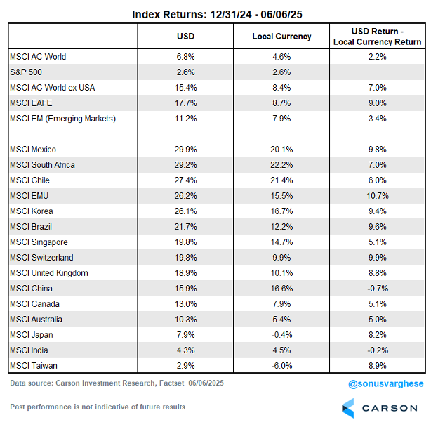 Although US returns have been fairly muted this year after the back-to-back 20% gains the previous two years, what might surprise many US investors is that most global stock markets are up nicely, with many making new 52-week or all-time highs. This is why having a globally diversified portfolio can benefit US-centric investors, as the US won’t always lead. The good news is we do anticipate the US may play catch up the rest of 2025, but big picture, this is a global bull market and investors are being rewarded for being in risk assets.