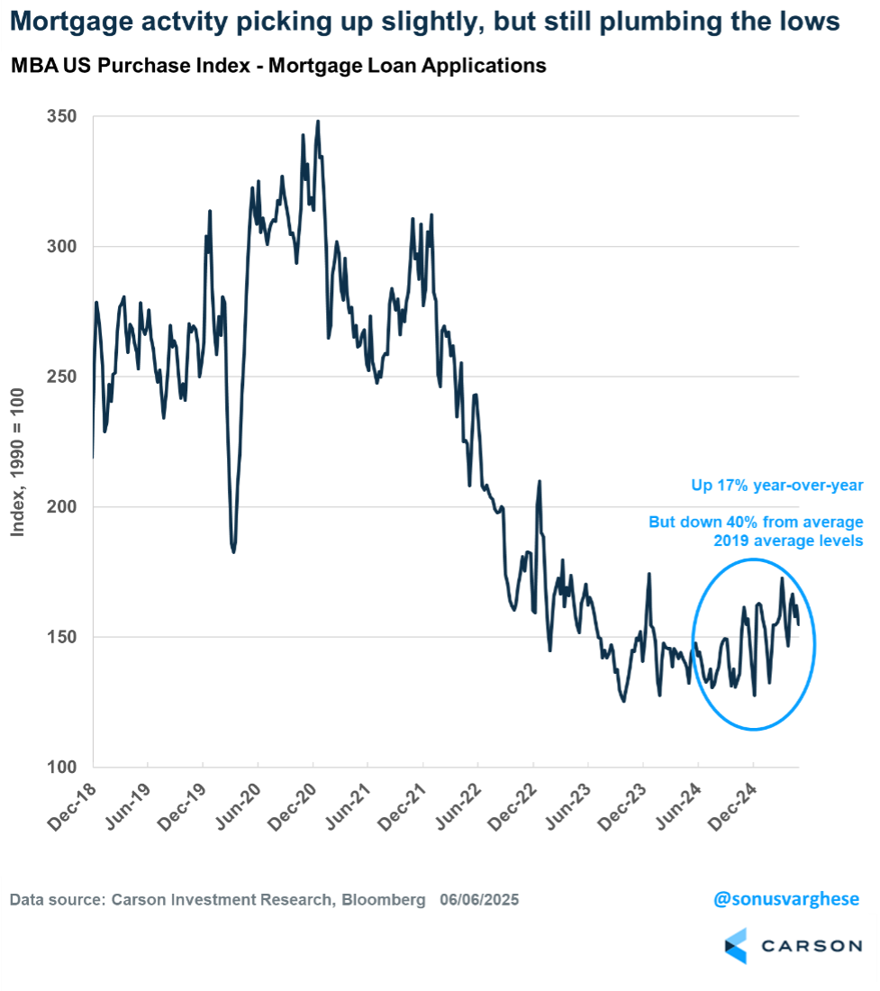 Even as supply is increasing, elevated mortgage rates close to 7% are creating a demand side problem as well. Mortgage applications are up 17% since last year, but they’re still a whopping 40% below average 2019 levels. Refinancings are down 65% from average 2019 levels. Remember, this a key mechanism by which homeowners can access home equity (which they have more of), but the door is shut because of elevated rates.