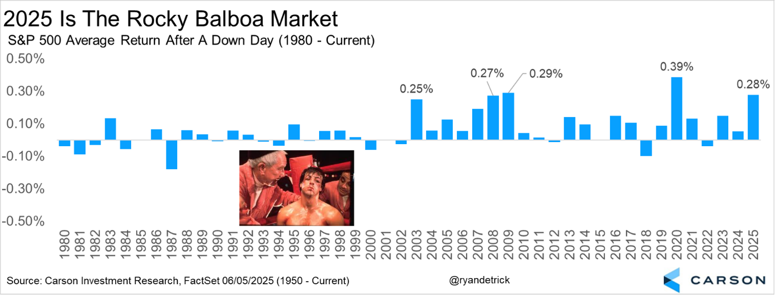 Something unique about 2025 so far is how stocks have bounced back when they’ve been down. We playfully have dubbed it the Rocky Balboa market, as Rocky might get knocked down, but he always got back up (except in his first fight with Clubber Lang in Rocky III, but he won the climactic rematch).