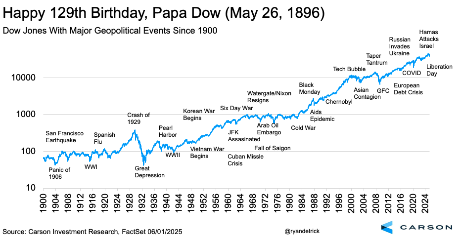 We had a big birthday last week, as the Dow Jones Industrial Average turned 129 years young! It is the second oldest index (the Dow Jones Transportation Average is older) and was first calculated on May 26, 1896 by Charles Dow, co-founder of both the Wall Street Journal and Dow Jones & Company.