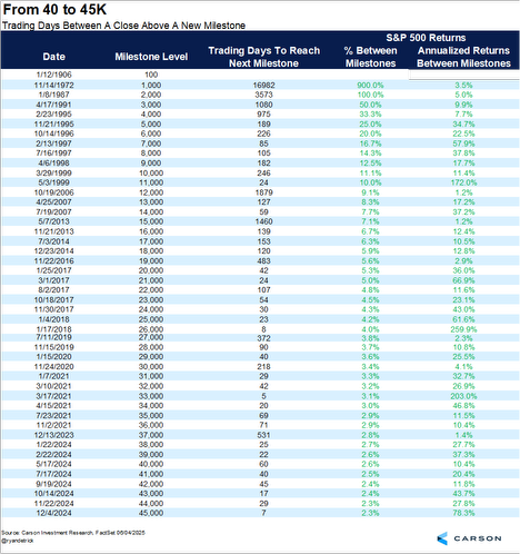 - Lastly, the Dow closed at about 100 in 1906 and 1,000 in 1972. It took until 1999 to get over 10,000 and recently peaked above 45,000 in December. The fasted 1,000 point milestone to milestone interval ever was only five days from 32,000 to 33,000 in March 2021. Any bets on when it breaks 100k?