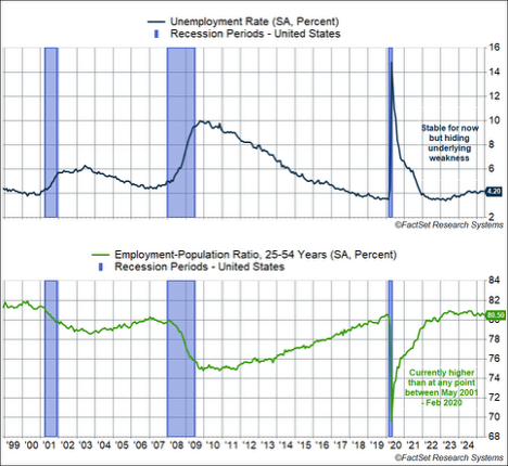 Moreover, with the headline data (like the unemployment rate) suggesting the labor market is ok, the Fed may believe it has time to wait for more data. The market’s currently expecting about two more 0.25%-point cuts from the Fed this year, but we may not even see one if the unemployment rate doesn’t move much higher than 4.5% (and given the falloff in immigration, it may not). So what looks like labor market resiliency on the surface may hide weakness under the surface.