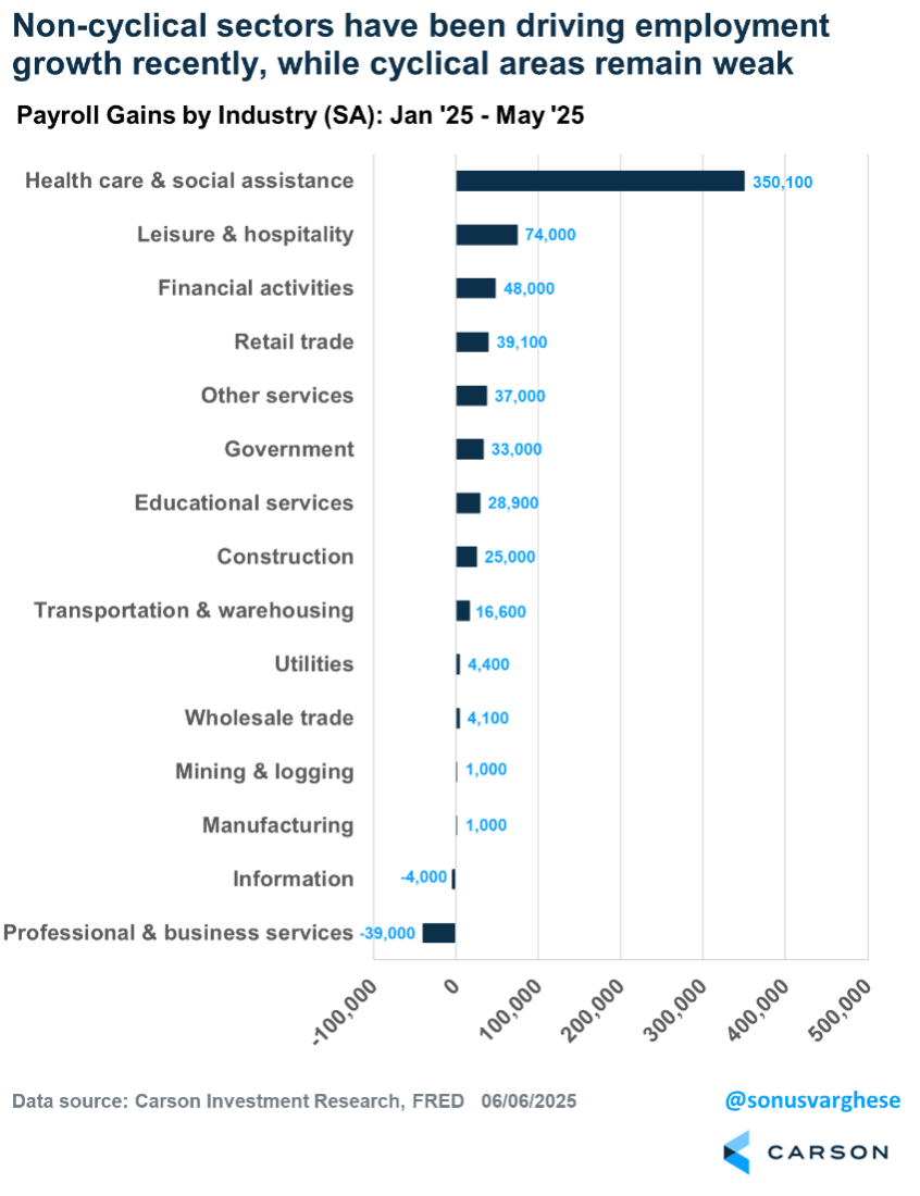 The composition of job growth across sectors also gave less cause for comfort. Close to 63% of jobs created in May were in the non-cyclical sectors of health care and social assistance and private education (+87,000). Employment in cyclical areas like professional and business services, information (including technology jobs), and manufacturing fell by 24,000. The one positive is that leisure and hospitality jobs rose by 48,000—these aren’t high-paying jobs but it tells you that service sector activity like restaurant spending and travel remain healthy.