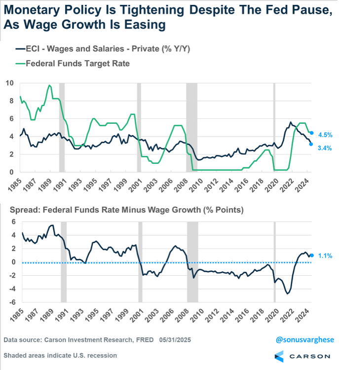 Also keep in mind that the Fed’s pause on rate cuts is not just maintaining a benign status quo—policy is implicitly getting tighter because wage growth is easing. Historically, when the fed funds rate rises well above the pace of wages, it means increasingly tight monetary policy, which has constricted the economy and ultimately led to recessions.