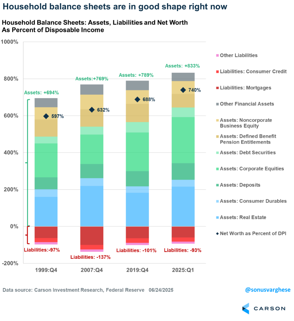 Here’s a chart we’ve been sharing for a few years now, showing how consumer balance sheets are in really good shape (in aggregate). As of 2025 Q1, net worth as a percent of disposable income is 740%, up from 688% at the end of 2019.