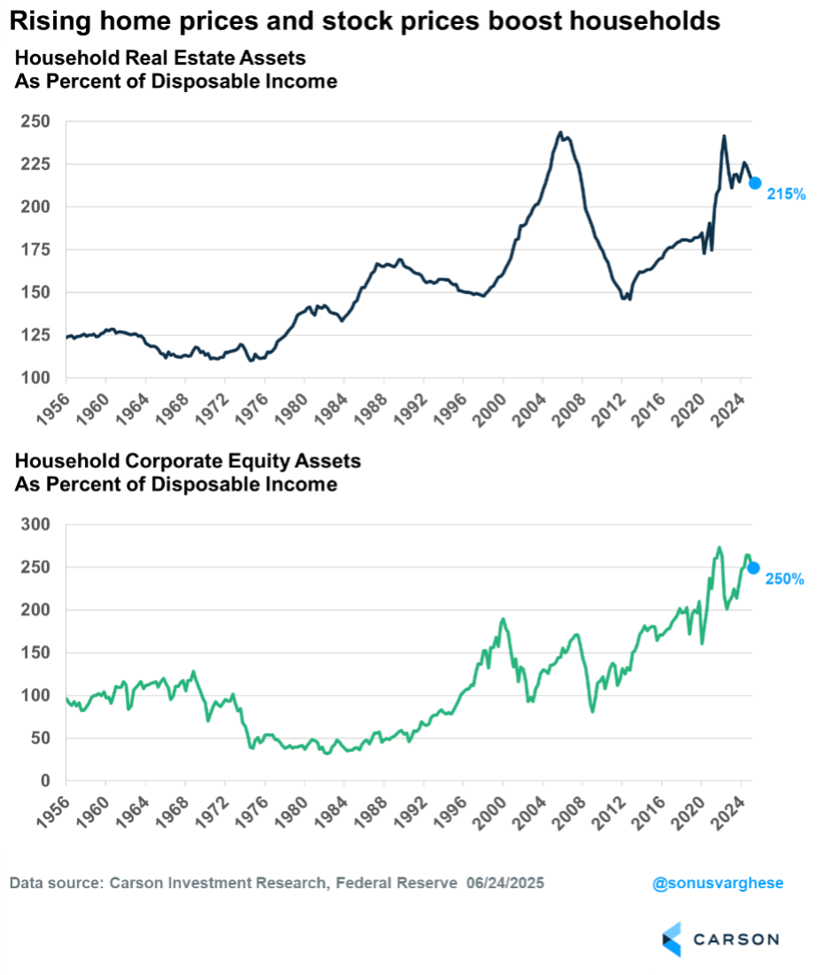 Second, rising home prices. Real estate assets are now at 215% of disposable income. That’s up from 183% at the end of 2019, and close to the 219% we had back in 2007, except now it’s happened without households taking on as much leverage.