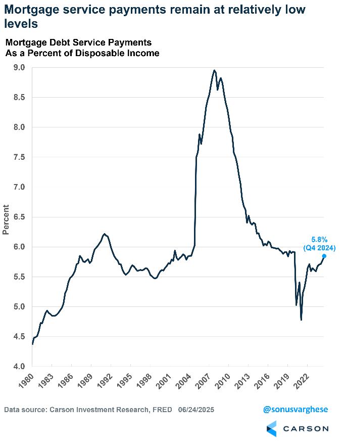 Keep in mind that households already have a significant amount of home equity, not to mention the fact that most households (at least those who bought or refinanced prior to 2022) have mortgage payments less than 8-12% of household income (on average). Mortgage service payments (and mortgages are the bulk of household liabilities) are running less than 6% of disposable income. That’s below what we saw in 2019, and that came at the end of a deleveraging cycle when households were trying to rebuild their balance sheets after the Great Recession (when stocks and home values crashed).