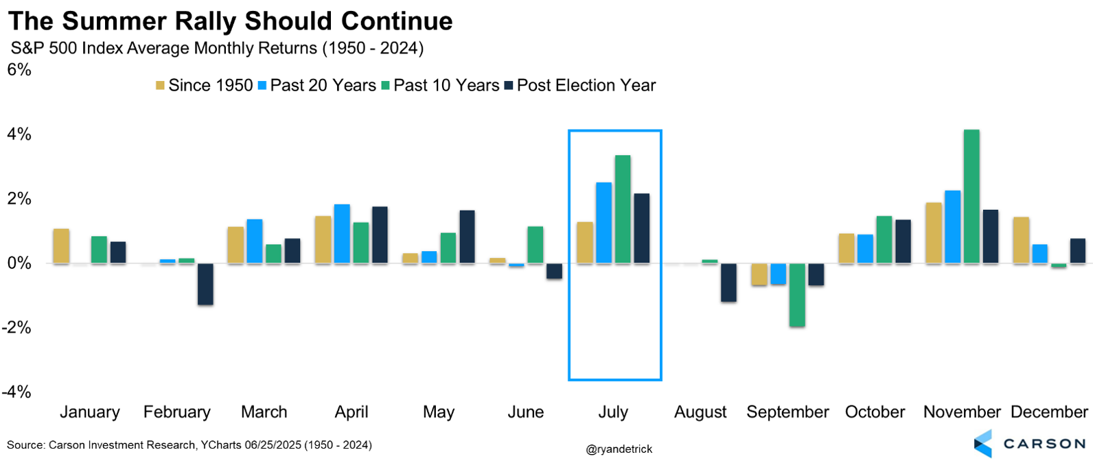 After gaining nearly 6% in May, for the best May since 1990, the S&P 500 is following it up with a very solid June (with one day to go the index is up more than 4%). The good news is July tends to be a very strong month for stocks and we don’t think this year will be any different, as this surprise summer rally continues.