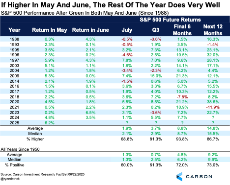 What caught our attention is the month of June historically hasn’t been very strong, but neither has May for that matter. So what has happened when both of these historically weak months are in the green (like 2025)? The answer is good things for the bulls.