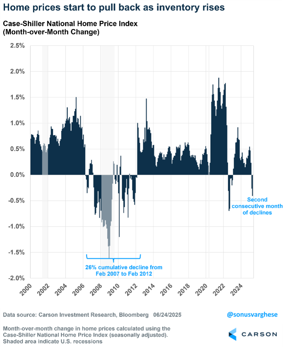 The national home price index is now up 2.7% over the last year, which is below the 3.4% expected. A year ago, home prices were up 6.4%, and back in December prices were up 4% trailing year, so this is a fairly sharp deceleration and it’s really about rising inventories. Inventories were the reason why prices rose in 2023–2024 despite falling home affordability. Inventories were low, and that drove prices higher. That’s no longer the case.