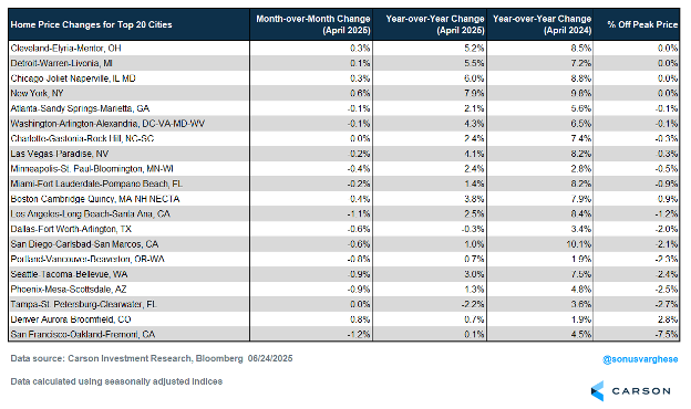Looking at the top 20 cities, prices rose in just four of them, mostly in the Midwest (Cleveland, Detroit, Chicago) and New York. A couple of cities are now seeing a year-over-year price drop (Tampa (-2.2%) and Dallas (-0.3%)). But you’re seeing a sharp deceleration in the year-over-year pace from one year ago (April 2024) across the board, with San Diego, Miami, LA, Tampa, and Charlotte topping the list.