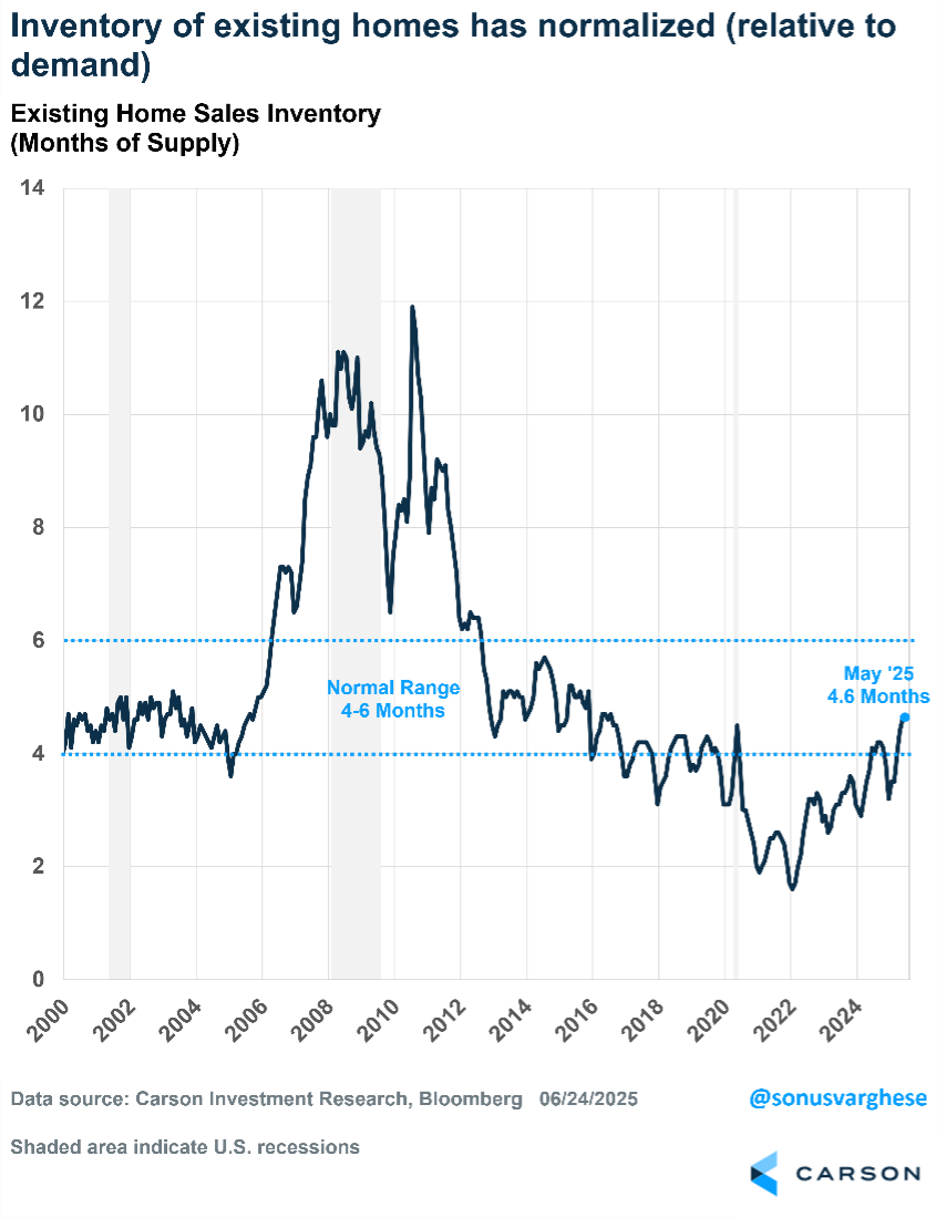 Higher home prices are good for homeowners unless you want to move to another home (because that home is also more expensive) with a higher mortgage rate. Of course, this can go on for only so long. If you have to move, you have to move, and this year we’re starting to see supply increasing. The inventory of existing homes (which widely outnumber new homes) is at 1.54 million as of May 2025, up 20% from a year ago. But inventory is still low relative to history—it’s down 12% from average 2019 levels.