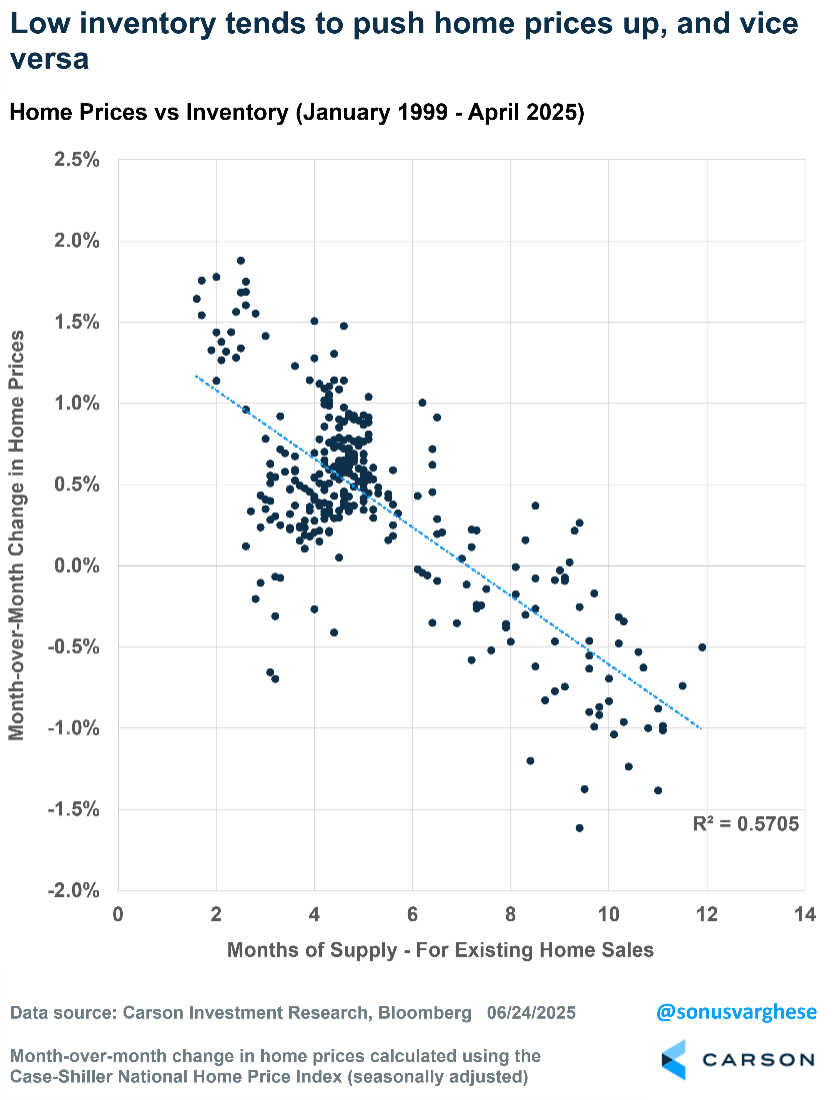Rising inventory, and normalization, is why home prices are now pulling back. Home prices have historically been inversely correlated with inventory levels. Over the last 25 years, we’ve seen that as inventory pulls back, home prices generally rise, and as inventory rises, home prices ease.