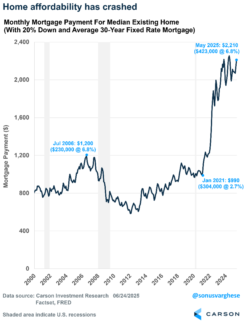 Affordability has hardly improved over the last two years. Keep in mind that in 2021–2022, wage growth was running around 5–6%, but that’s pulled back to below 4% now (using the Employment Cost Index). Meanwhile, mortgage rates have gone in the other direction. Also, the median home price has increased by 49% over the last five years.