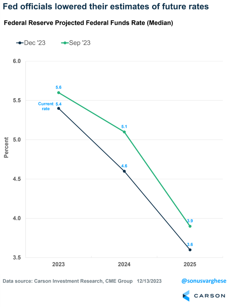 - They moved the 2024 rate estimate from 5.1% to 4.6%. The current rate is 5.4%, so the updated estimate implies the Fed will cut rates by around 0.8% (about three 0.25% cuts) in 2023.