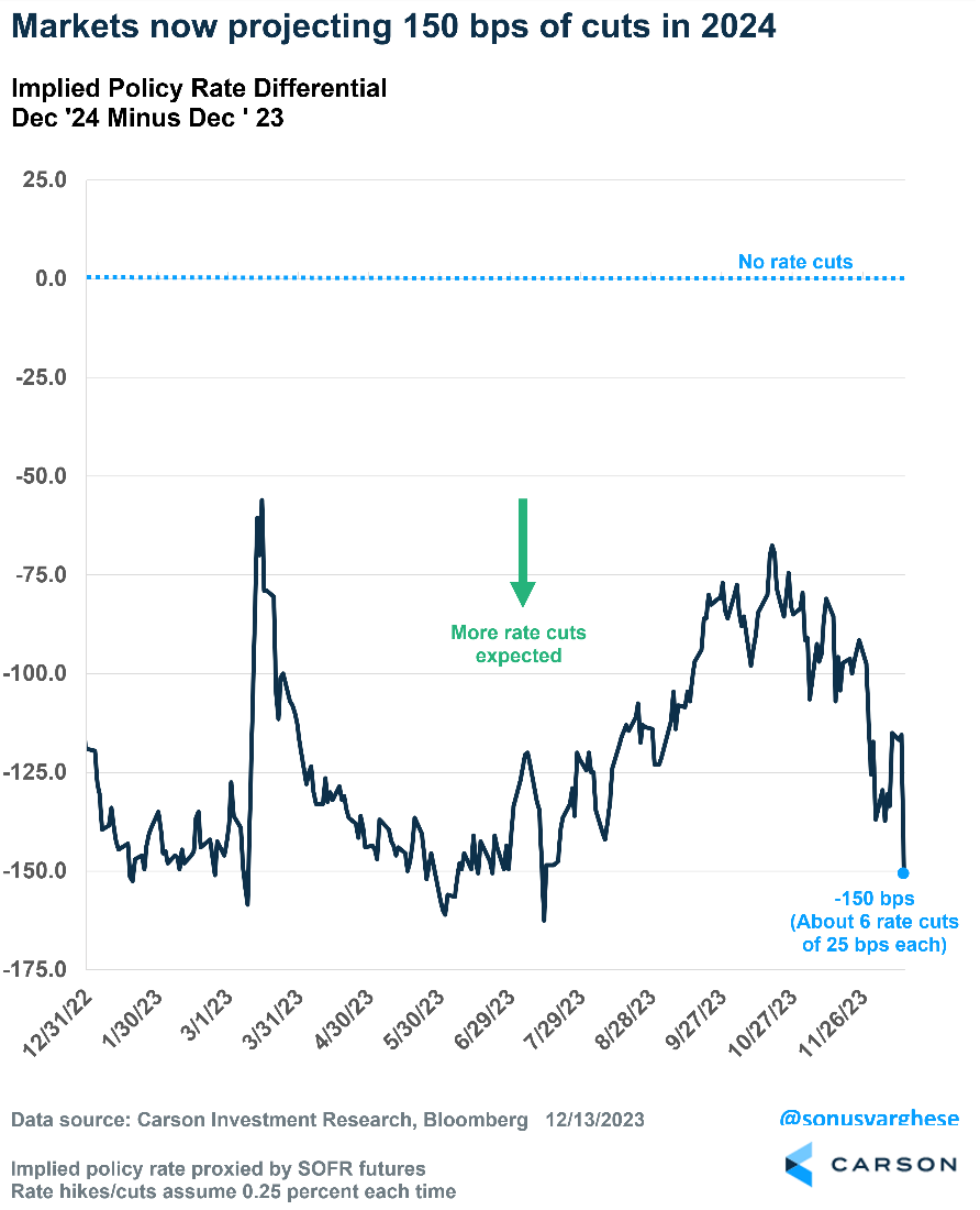 - The Federal Reserve acknowledged that inflation is easing faster than expected, and Fed members will likely start cutting rates in the first half of 2024.