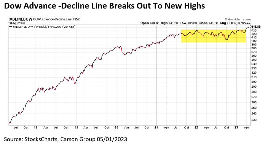 The Dow A/D line recently reached new highs after consolidating for more than a year. With the Dow about 6% away from new highs, this is a clue that the nearly 125-year-old index may be following the A/D line to new highs sooner than later.