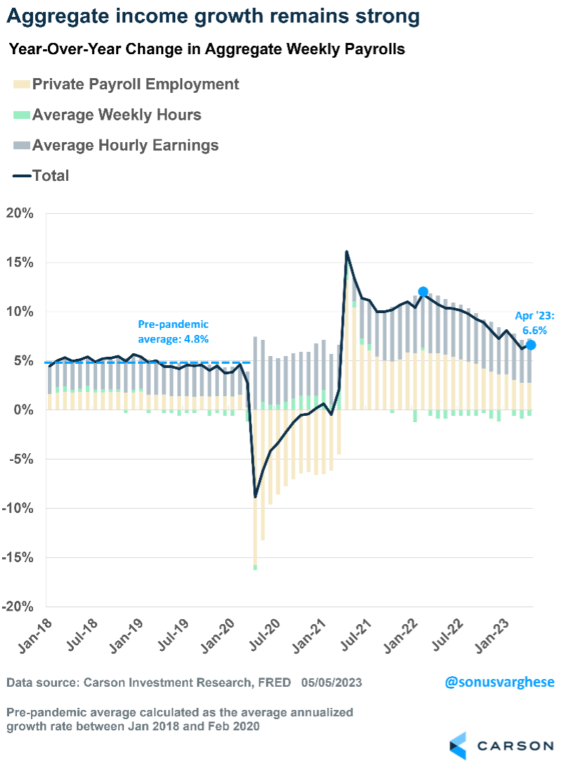 If you were worried about a sudden stop for the economy on the back of a banking crisis, fear not. The April employment data suggests the economy is doing just fine, and perhaps more than fine. Of course, the banking crisis is a problem. Banks are tightening credit availability, but that will likely be a slow-moving adverse force on the economy.