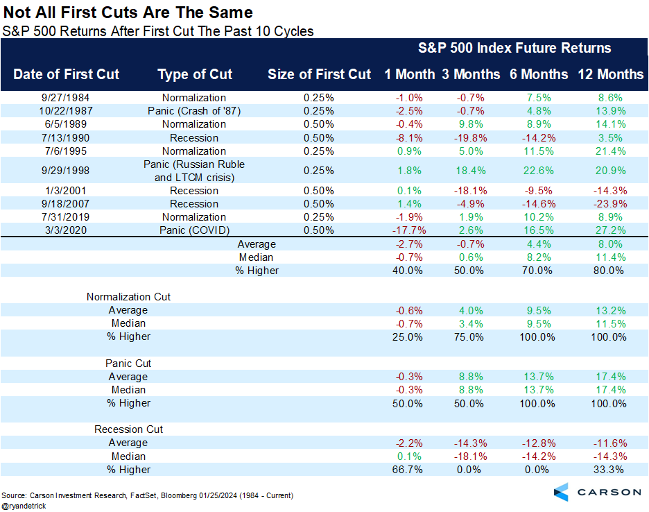 There’s also a concern that Fed “panic cuts” have historically signaled a recession ahead. But context is important. Below we put together a chart showing what stocks did after historical rate cut cycles began. Except for 1989, the 0.50%-point cuts all coincided with recessions – 1990, 2001, 2007, and 2020 – and stocks were hit over the next 3-6 months. But here’s the thing – in each of these cases, the Fed was well behind the curve and was playing catch-up. The economy was already in a recession, or close to one, by the time they began cutting rates.