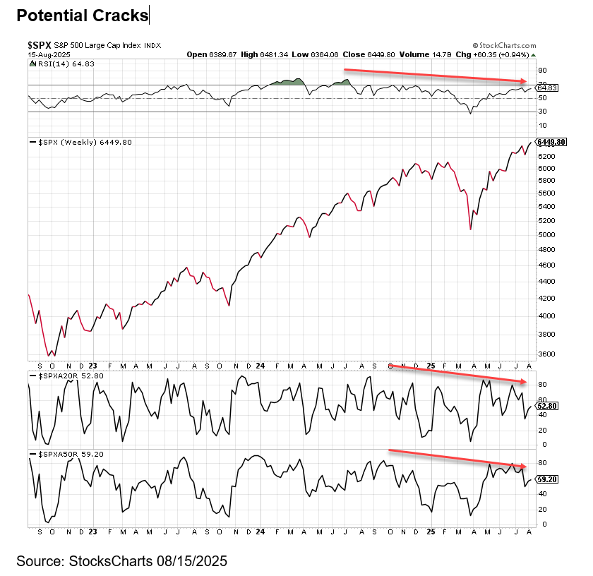 We will keep this fairly simple, but the number of stocks in the S&P 500 that are above their 20- and 50-day moving averages is lower than it was a month ago, even though the S&P 500 has moved higher. We call this a negative divergence and it could be a clue there is weakness under the surface. Additionally, we are seeing other negative divergences from other indicators we follow. Again, this isn’t over-the-top bearish action, but this coupled with the negative seasonal period we are in could suggest a well-deserved break is possible.