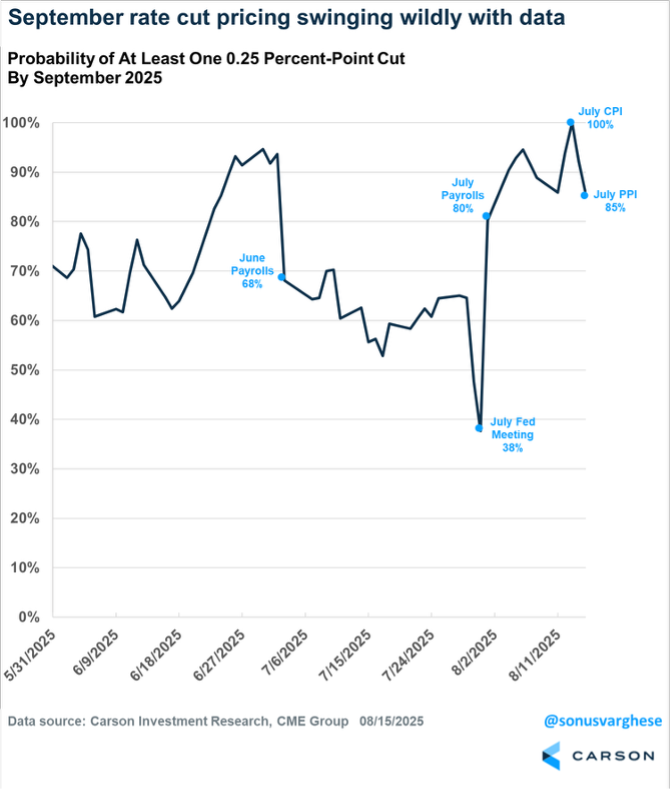The market cheered the July Consumer Price Index (“CPI”) inflation report released on August 13, 2025, but mostly because it was perceived to be good enough to keep the Federal Reserve (“Fed”) on track for a September rate cut. The market-implied odds for a September cut rose from about 85% to 100%, according to the CME Groups FedWatch tool—implying investors thought a rate cut in September was a lock. However, the July Producer Price Index (“PPI”) report released the next day took those odds back down to 85%—a cut is still the base case, but not quite a certainty. The volatility around September rate cut expectations is something we’ve seen for a few months now, especially after payroll data. Rate cut expectations fell after a strong June payroll report and plunged below 50% on Powell’s hawkish comments following the Fed’s July meeting. Then expectations completely reversed after the weak July payroll report release.