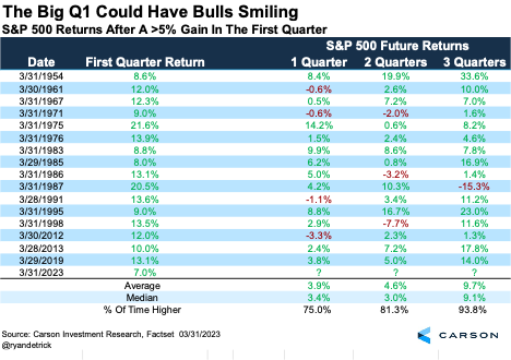 The first signal is the S&P 500 had its best first quarter since 2019, up 7.0%, which came on the heels of a 7.1% gain the previous quarter. Big first quarters often lead to continued gains. Out of 16 first quarters that gained at least 5%, the final three quarters of the year finished higher 15 times. The one outlier was 1987, which might raise a flag for some. But considering stocks were up 40% for the year by August 1987, we’ll start to worry if returns reach those heights, which we do not expect. Until then, the strong first quarter is just another clue the bulls could have a nice 2023.